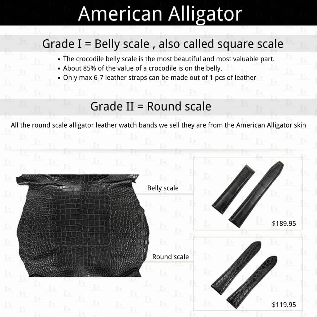 Understanding the above background, it is not difficult to guess why the bad businessman trick us . More common, the process of Nile crocodile and  Siamese crocodile is masquerading as American crocodile,  which most people can not see the difference, but the cost difference is very large, the business need to be honest and has a long-term business philosophy in choosing the material.  The worse, they are masquerading the embossing cowhide that a lot of people would recognize as crocodile skin. Be sure to read the material: If it says alligator grain cowhide, or bamboo grain leather, or square-scale embossed, they are actually all calfskin. When you buy genuine alligator leather watchband online, read the material carefully, make sure it is genuine American Alligator with square scale (or belly-scale). Not embossed calfskin.